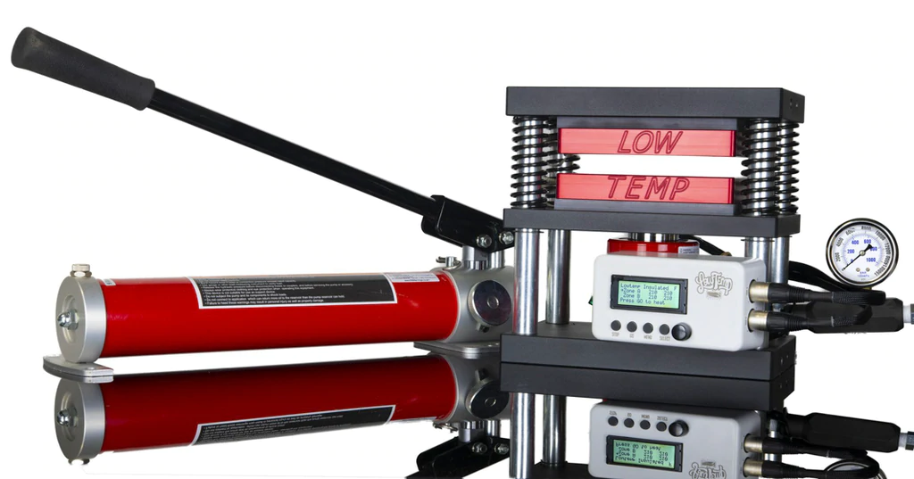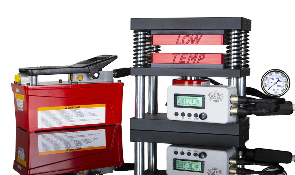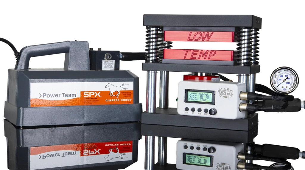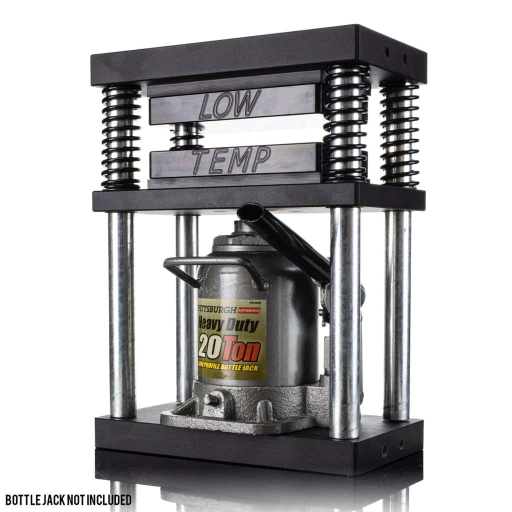 Press only: This option is for customers who already own a Lowtemp Plate or Cage kit, upgrading to our new Lowtemp Press with their current controller and adding their own hydraulics. All mounting accessories and hardware included. 4" taller to support bottle jacks. Press with Controller: This option includes the Lowtemp Press with Controller. This is a full kit, which allows you to add your own bottle jack ($40). Great for high quality, portable, reliable, budget builds! This system's structure support rods are 4" longer to fit bottle jacks. Press with Controller and Standard Compact BVA Hand Pump: This solution is out of the box, plug and play. All hydraulics come assembled, bled, and tested. Includes a 20 ton low profile BVA cylinder, ultra compact 2 speed aluminum pump, pressure gauge included. **Option to upgrade for +$250 to our premium, high flow BVA P1000 pump. This features more travel per stroke and a longer handle for extra leverage. Ideal for high workloads** Press with Controller and BVA Air pump: Requires an Air compressor. The pump is technically a foot pedal that is operated by stepping on a pedal, but can also be operated by hand pressure. 20 ton low profile cylinder, pressure gauge included. Press with Controller and SPX Electric pump: Fully automated Electric over hydraulic system with very little noise. Great for large scale operations or anyone looking for a press to run itself at the touch of a button. 20 ton low profile cylinder, pressure gauge included. Additional Options- Already own a set of our 3x5 or 4x7 plates/cage? Purchase our press without a controller to save some money. The controllers are the exact same! We will still include all hardware, legs, etc with the press.