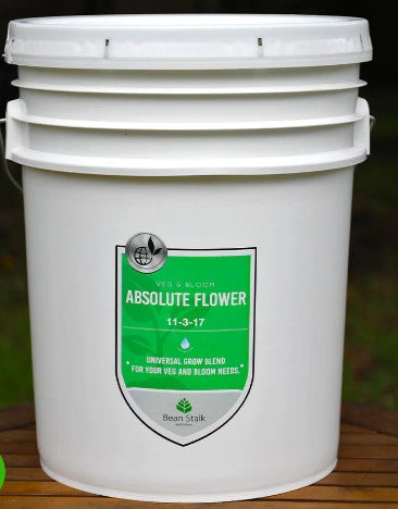Absolute Flower is the vegetative fertilizer for the plants through the finish of flower. It is applied at a rate of 15 grams per gallon of soil and either sub dressed or fully integrated into the soil. This is used in conjunction with both the 1.0.31 as well as the 12.0.0 23%Ca depending upon the growing environment and media used. It is recommended to use a higher rate of 20 grams per gallon if flowering in small containers.