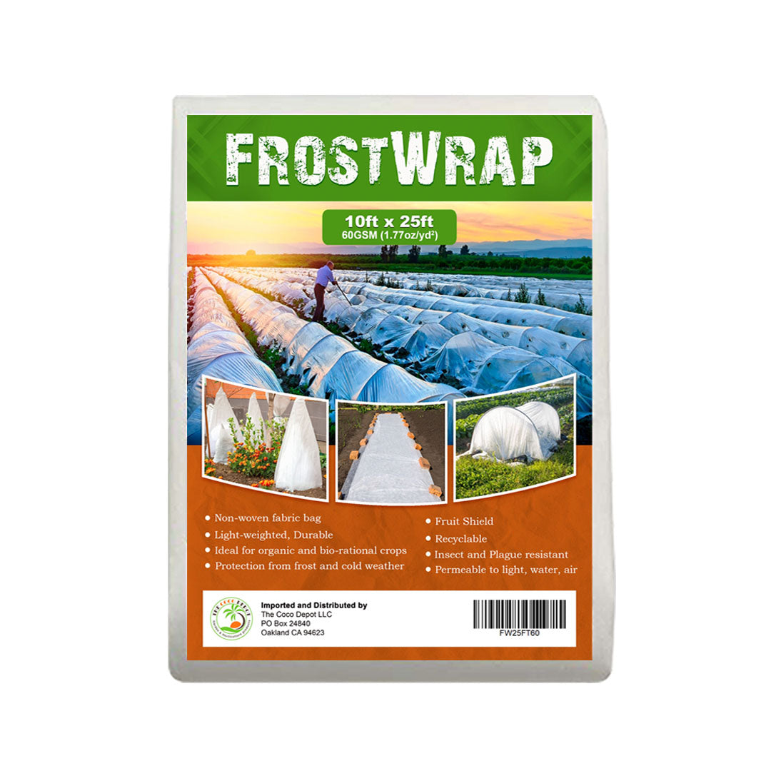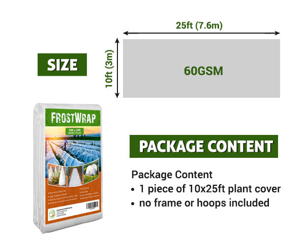 FrostWrap, Freeze and Crop Protection Plant Cover - 1.77oz/yd2 (60 GSM) of Fabric Non-woven 10ft x 25ft Reusable Garden Floating Row Cover for vegetables, fruit, tree, plants Sun-Pest protection.