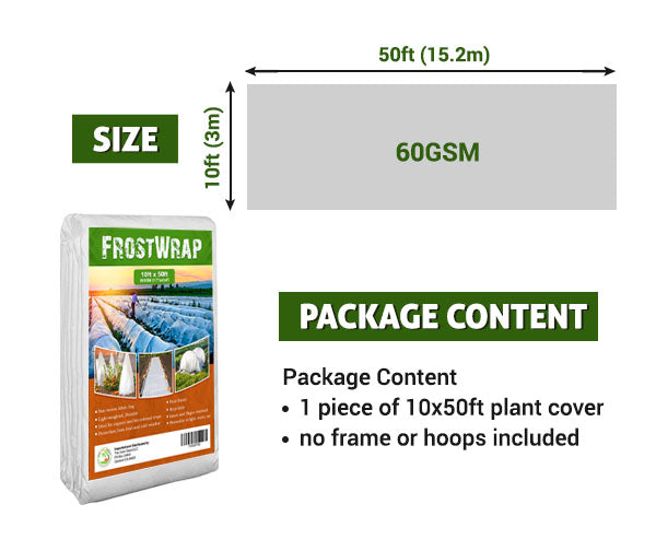 Our standard-size FrostWrap facilitates a large coverage area twice its length and smallest being half of the original. The cover can be wholly used as a garden plant blanket and protect garden plots or cut into different sizes for different use, to cover over the plants such as pumpkins, strawberries, shrub tomatoes, eggplant, pepper and more.