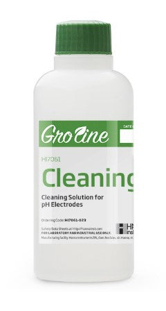 HI7061-012 is the GroLine general purpose cleaning solution that can be used for a variety of applications. Electrodes can become dirty from use and will produce inaccurate results even as they read correctly in a pH buffer. Hanna's cleaning solutions eliminate impurities and residues that are left on electrode surfaces when immersed in samples during measurement or when stored incorrectly. Hanna suggests cleaning the bulb and junction of your electrode on a regular basis to ensure that the probe is always clean and to prevent any clogging of the junction.