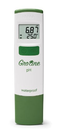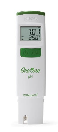 The GroLine HI98118 pH/temperature tester is our latest pocket meter for measuring the pH of a hydroponic nutrient solution. This modern looking meter is only 0.7" thick and extremely ergonomic, fitting comfortably in your hand. The HI98118 has a very large easy to read LCD display that shows both pH and temperature along with calibration, stability and low battery indicators. All operations are simplified to two buttons. One is for turning the meter on/off and the other for automatic one or two point calibration.