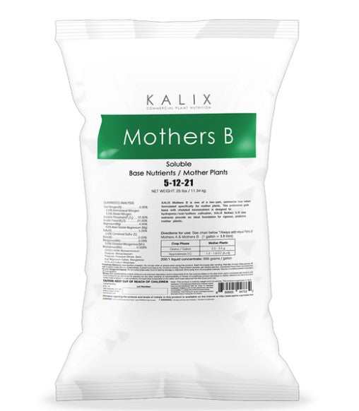 KALIX Mothers B is one of a two-part, commercial base nutrient formulated specifically for mother plants. This professional grade base with chelated micronutrient is designed for hydroponic/soil/soilless cultivation. KALIX Mothers A/B base nutrients provide an ideal foundation for vigorous, productive mother plants.