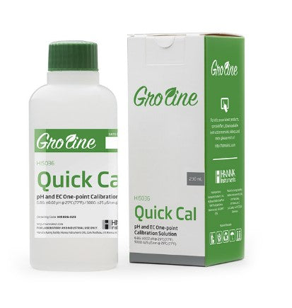 HI5036-012 is a quick calibration solution for use with Hanna's GroLine pH and/or EC/TDS meters. Using the Quick Cal function found in compatible meters allows for a single point calibration for pH and/or conductivity sensors. Each bottle has the lot number and expiration date. Hanna's line of calibration solutions have been specially formulated to have an expiration of 5 years from the date of manufacture for an unopened bottle. The HI5036-012 is for 120 mL of calibration solution.